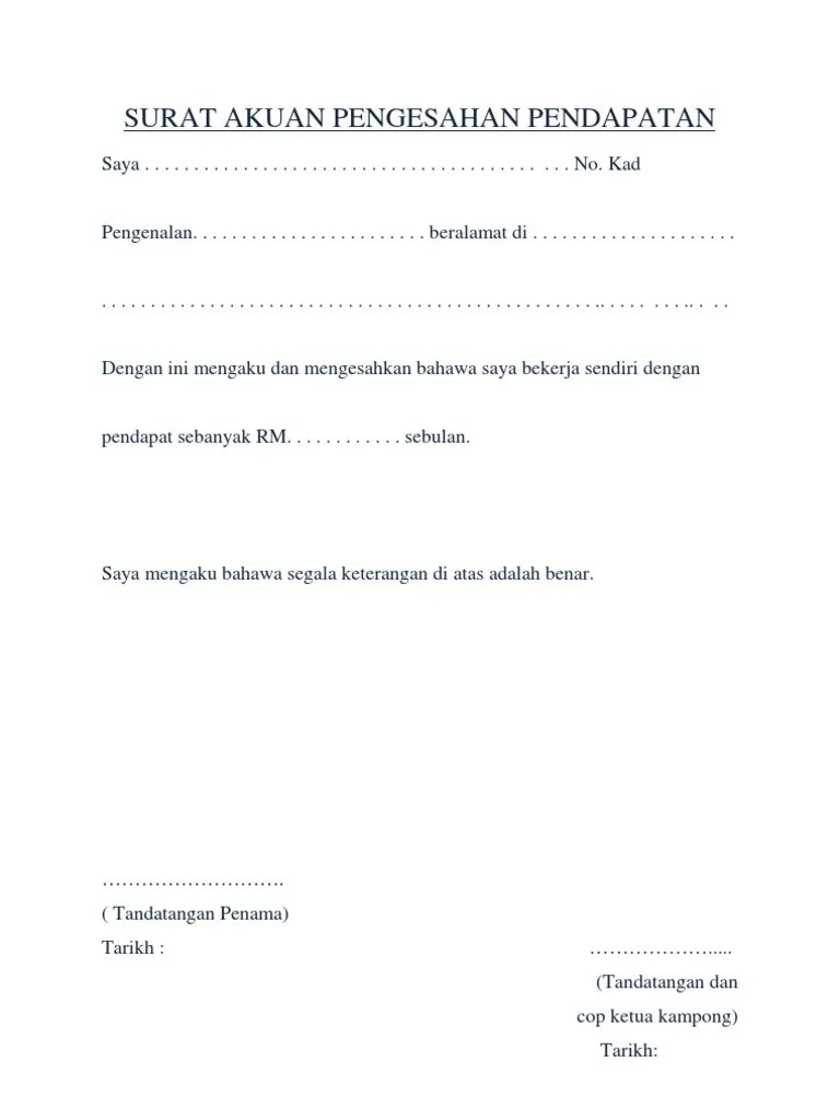 Format surat confirmation daripada majikan untuk tujuan pinjaman, beli rumah, sambung belajar dan sebagainya. Pengesahan dari ketua kampung / ketua penduduk / pesuruhjaya sumpah. Sejak dari tahun 2009 sebagai pekerja am dengan purata pendapatan sebanyak rm xxxx.xx. Unduh sebagai pdf, txt atau baca online dari scribd. Anda boleh nyatakan juga dalam surat jika anda ingin membuat potongan gaji terus untuk pembayaran balik pembiayaan pinjaman yang diberikan oleh . Doc surat akuan pengesahan pendapatan mohd rozali mohd pozi academia edu. Contoh surat pengesahan majikan dan jawatan. Contoh format surat pengesahan majikan 2. Sbesk surat pengesahan dari majikan pemohon telah disahkan dalam jawatan & bebas dari tindakan disiplin/tatatertib pengurus cawangan bank pertanian malaysia . Contoh deraf surat pengesahan majikan (bagi pemohon bekerja sendiri). Pendapatan atau slip gaji yang dikeluarkan oleh pihak majikan.